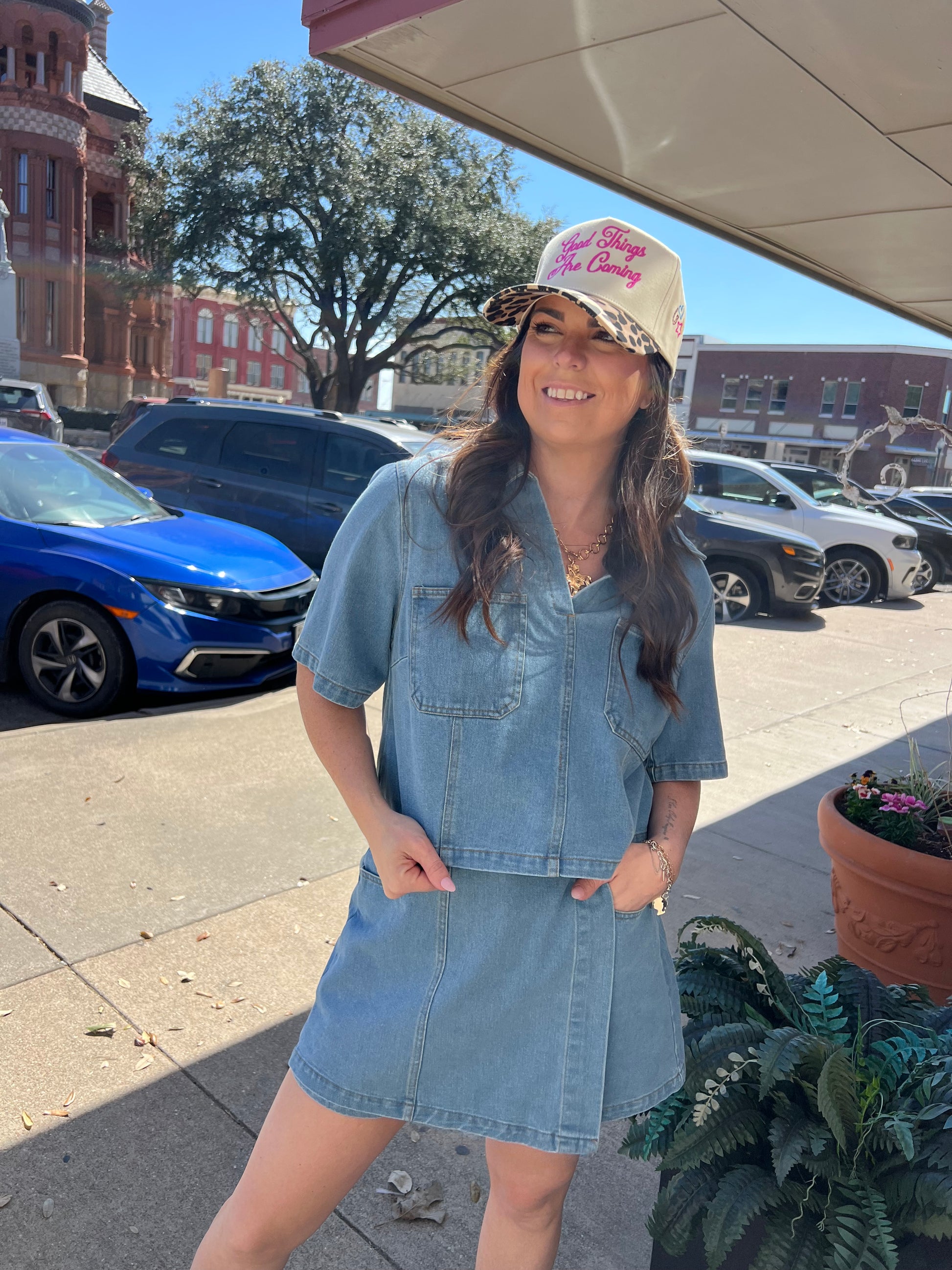 Denim fabric, Runs true to size with a loose/boxy fit.