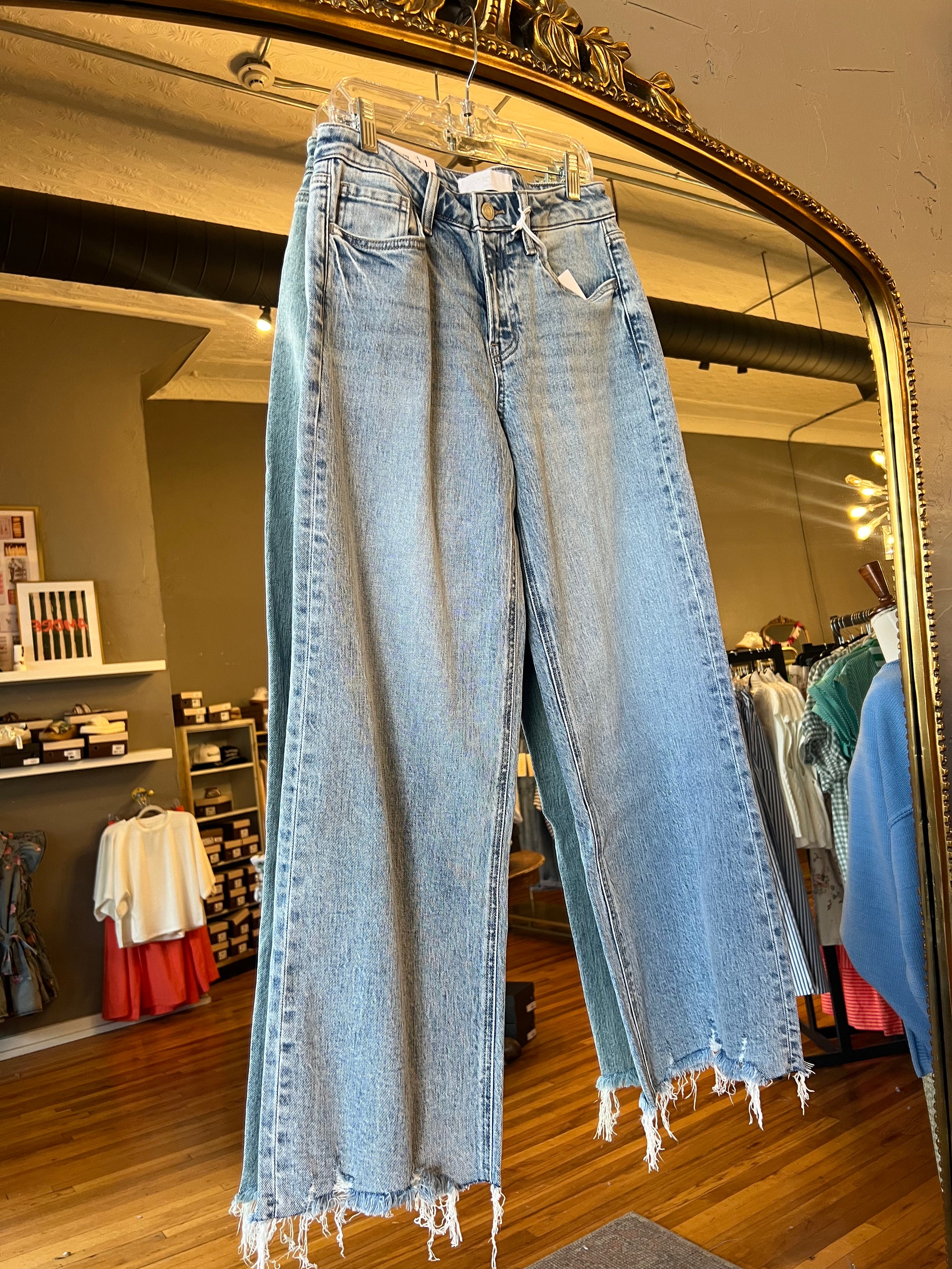 Mid Rise, Ankle Wide Leg (just a bit looser than a straight leg), 99% cotton 1% spandex (some stretch) 28" inseam.