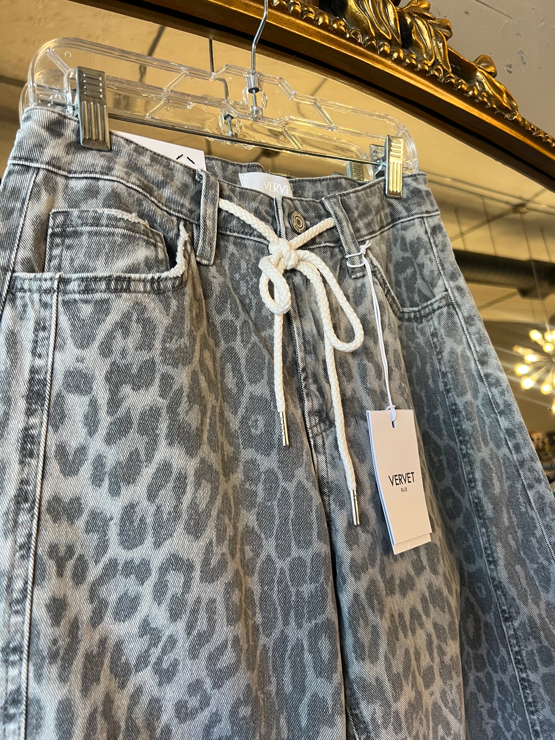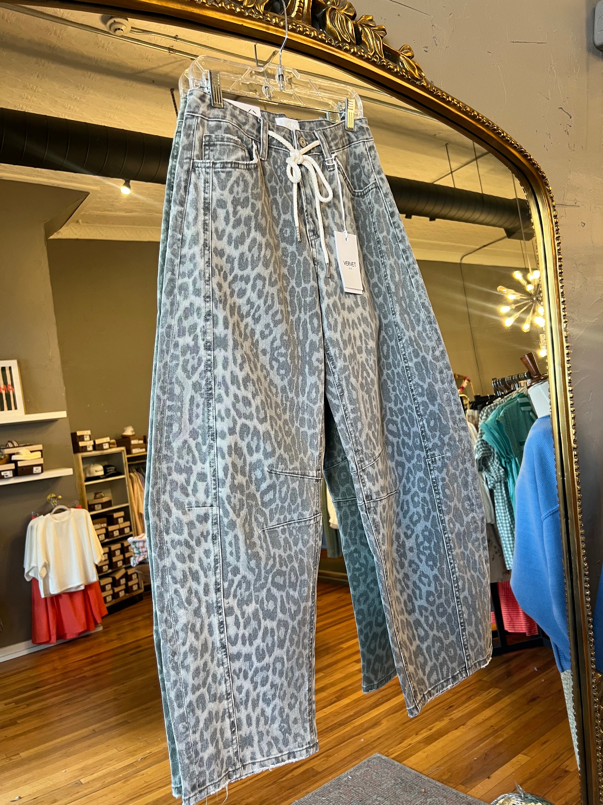 High Rise, Leopard Print Barrel, 98.5% cotton 1.5% lycra (stretch), 27" inseam